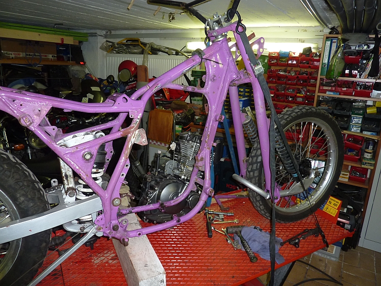 24ter Mai - Heute sind die Rahmenteile vom Pulverbeschichter zurück gekommen - Danke an meinen Freund Holger der den Kontakt hatte - die beiden Schwingen von Vorderradgabel und Seitenwagen fehlen noch da wohl etwas Öl aus den Lagerstellen in die Pulvermasse gelaufen ist. Die Teile werden nochmal gemacht - es war wohl nicht so einfach einen Sandstrahlbetrieb zu finden der den großen Seitenwagenrahmen strahlen konnte! Ein LKW Entlacker hatte dann genug Platz. Jetzt geht es wieder an den Zusammenbau....