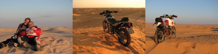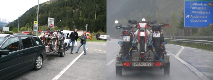 An der Beta von Bettina dagegen waren die Umbauten schnell erledigt - eine größere Ständerfußplatte, Reifen und das Geländeritzel mit 14 Zähnen und schon war sie fertig. Einen großen Tank bekommt man nicht wirklich und deswegen sollte die Beta im Falle eines Falles von den anderen mitversorgt werden. Beide Motorräder bekamen natürlich vorher noch eine große Inspektion und auf Rat unseres Reiseleiters noch neue Kupplungen - überhaupt wurden wir von Carsten und Tina entsprechend beraten. Wir trafen uns einige Male bevor es losgehen sollte um alles zu besprechen. Wir haben sogar soviel besprochen das es zwischendurch manchmal zu kleinen Reibereien, Frötzeleien und bösen Vorahnungen kam die uns aber nicht hindern sollten Donnerstagsnacht los zu fahren - Aber soweit sind wir ja noch nicht! Bettinas Beta ist jedenfalls so spät fertig geworden das ich kein Foto mehr machen konnte bevor sie auf den Anhänger geschoben wurde - Wie immer Punktlandung, kurz vor knapp fertig! Unser Gepäck bestand aus wirklich WENIGEN persönlichen Dingen, der Campingausrüstung, Werkzeug mit Pannenmaterial, einem Laserschwert und wog deutlich zuviel! Insgesamt haben wir auf beide Motorräder 42Kg Gepäck verteilt - zum Vergleich: Aügels hatte wie wir ca. 21+ Kg und Carsten und Tina unglaubliche 13 -15Kg pro Motorrad (Trotz Laserschwert und Kostümen)! Der Plan war: Donnerstag Nacht bzw. Freitag frühmorgens mit dem Auto/Anhänger nach Genua/Umland dort übernachten, Samstag früh/pünktlich mit den Moppeds auf die Fähre nach Tunis dann 14 Tage Tunesienrundreise vollgepackt mit Programmpunkten und Stollenblödsinn, danach wieder Samstags auf die Fähre von Tunis nach Genua zum Auto (welches dann dort noch hoffentlich steht) und schnell noch die 1000 Km in Richtung Heimat. Soweit der Plan.........
